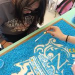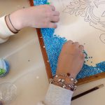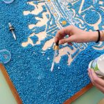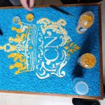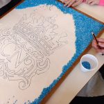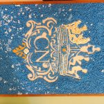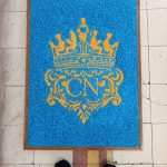 Si tratta di una bellissima iniziativa artigianale, in cui il contrasto cromatico tra l’azzurro del fondo e l’oro del logo rende il lavoro molto d’impatto. La tecnica utilizzata è quella del mosaico materico su supporto in legno: l’uso delle pietre colorate aggiunge una texture che valorizza profondamente il simbolo storico del Convitto, conferendogli una tridimensionalità dinamica. L’assemblaggio è stato eseguito con estrema precisione utilizzando colla vinilica su un disegno preparatorio rigoroso, completando il tutto con una cornice perimetrale che definisce lo spazio dell’opera e ne esalta il pregio.